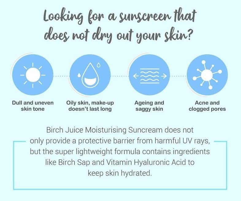 Birch Juice Feuchtigkeitsspendender Sonnenschutz bietet nicht nur eine Schutzbarriere vor schädlichen UV-Strahlen, sondern die superleichte Formel enthält Inhaltsstoffe wie Birkensaft und Vitamin Hyaluronsäure, um die Haut hydratisiert zu halten.