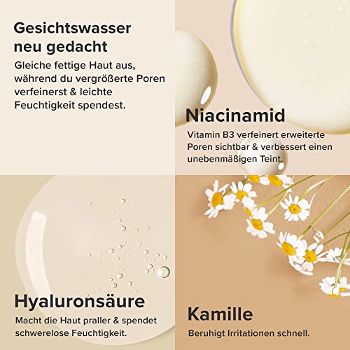 POREN VERKLEINERN: Leichtes Gesichtswasser bringt die Haut in Balance, das fettige Haut mattiert, Poren verkleinert & Rötungen bekämpft. Mit reichhaltige Antioxidantien und regenerierende Inhaltsstoffe. Vermindert Hautrötungen, die durch Unreinheiten oder empfindliche Haut verursacht werden.