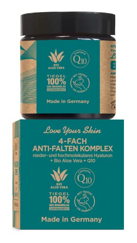 HOCHWIRKSAMER 4-FACH ANTI FALTEN KOMPLEX – 1. HOCHMOLEKULARE HYALURONSÄURE : Glättet Falten auf der Hautoberfläche auf und sorgt für mehr Elastizität der Haut. 2. NIEDERMOLEKULARE HYALURONSÄURE : Dringt tief in die untersten Hautschichten ein und versorgt diese nachhaltig mit Feuchtigkeit . 3. COENZYM Q10 : Aktiviert die Zellerneuerung und wirkt anti-oxidativ (beugt Hautalterung vor). 4. BIO ALOE VERA : Erhöht die Hautfeuchte, verbessert die Durchblutung und stärkt nachhaltig das Bindegewebe.