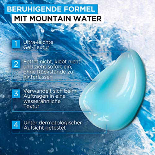 Schnell einziehende Formel angereichert mit Mountain Water und Hyaluronsäure, Leichte Gel-zu-Wasser-Textur, Nicht fettend, Nicht klebend